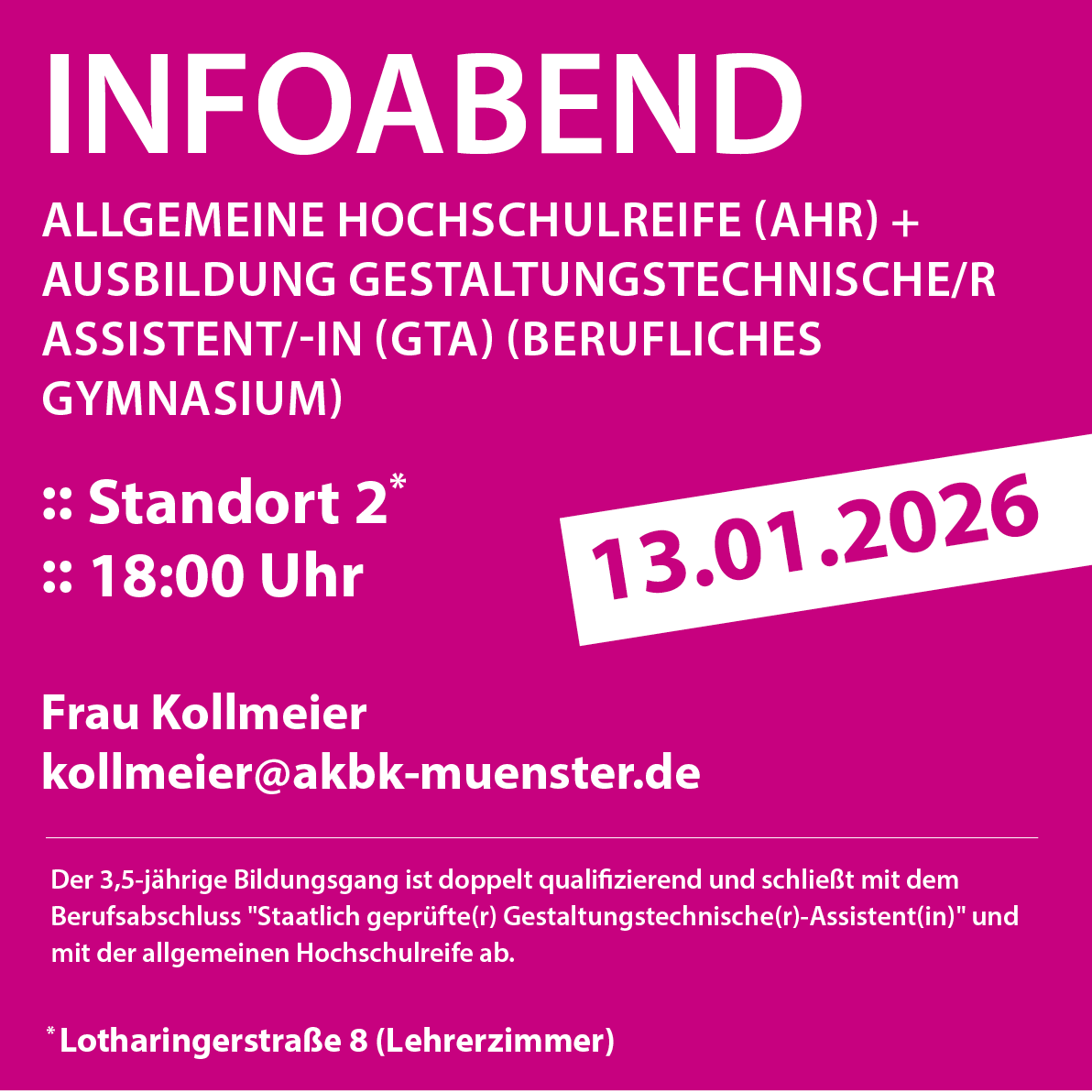 Das Berufliche Gymnasium für Gestaltung bietet Ihnen einen doppelt qualifizierenden Abschluss an. Als künstlerisch begabter und an modernem Design interessierter junger Mensch können Sie hier die Allgemeine Hochschulreife (Abitur) und zusätzlich einen Berufsabschluss nach Landesrecht als staatlich anerkannte(r) Gestaltungstechnische(r) Assistent(in) (GTA) erreichen. Das erlaubt Ihnen den freien Zugang zum Studium an allen Fachhochschulen und Universitäten.