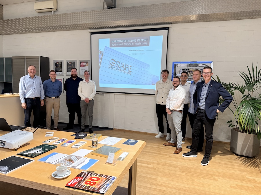 Die letzte Exkursion führte die Studierenden schließlich nach Bielefeld zu einem der führenden Spezialisten im Bereich der Druckveredelung, der Firma Gräfe Druckveredelung GmbH. Hier erläuterte Geschäftsführer Frank Denninghoff mit viel Begeisterung die unterschiedlichen Möglichkeiten der Druckveredelung und gab den Studierenden auch viele Tipps aus seinem Berufsleben. Die unterschiedlichen und hochwertigen Produktmuster wurden während der Präsentation synchron analysiert und gaben den Studierenden vertiefte Einblicke in die Produktionabläufe, bevor diese später an den Maschinen live nachverfolgt werden konnten. Zum Abschluss stattete Herr Denninghoff die Studierenden noch mit hochwertigem Anschauungsmaterial, wie z. B. dem aktuellen Veredelungskalender aus.