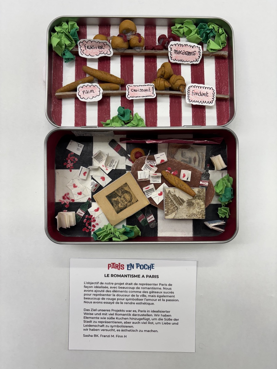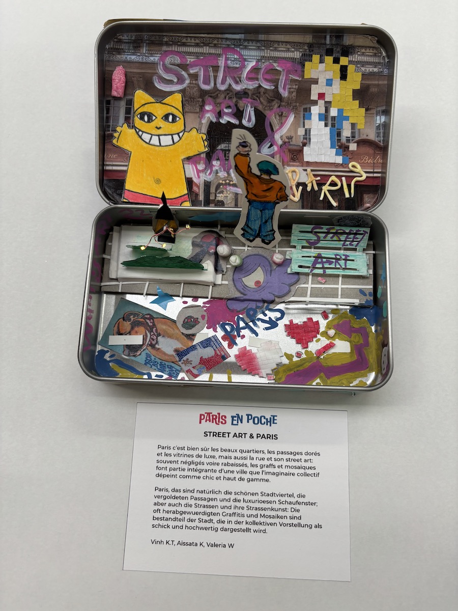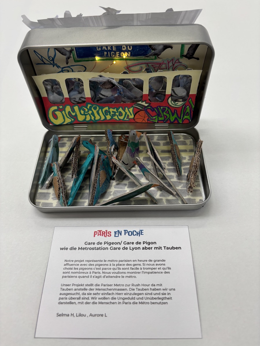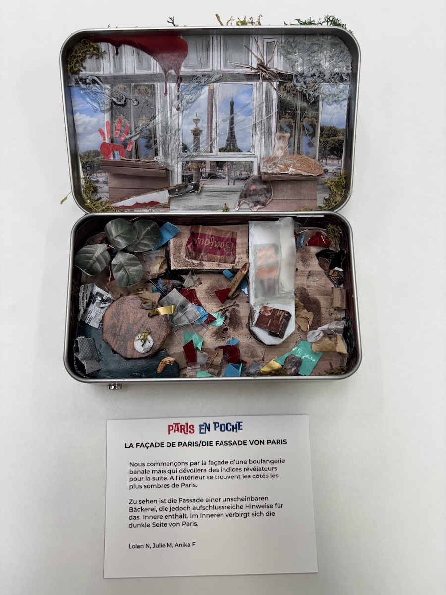 Die SchülerInnen hielten während dieser Exkursionen ihre Eindrücke in Form von Fotos und Skizzen fest, welche sie dann in den Workshops an der Partnerschule nutzten, um in Gruppen Dioramas von Paris aus unterschiedlichen Perspektiven anzufertigen. So entstanden 14 Miniaturen von Paris zu ganz unterschiedlichen Themen wie „Die Stadt mit den zwei Gesichtern“, „Anonymität in der Großstadt“, „Pulsierendes Paris“ und „Romantisches Paris“.